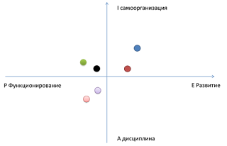 У певному сенсі «вітаміни менеджменту» — це спосіб популяризації підходу І. Адізеса. Вони прості та інтуїтивно зрозумілі. Підібрати загальну основу для класифікації цілком можливо, хоча ніде в книгах І.Адізеса вона явно не описана. По суті, виділені характеристики є дві протилежні пари параметрів, що описують стилі управління. Їх можна переформулювати так: ‘функціонування’ — ‘розвиток’, ‘дисципліна’ — ‘самоорганізація’. Якщо побудувати декартові координати з цими характеристиками та виміряти відповідні прояви стилю управління у топ-менеджерів Вашої компанії (на діаграмі Ви бачите шість точок, що відповідають координатам шести топ-менеджерів), Ви отримаєте уявлення про те, де «центр» мас Вашої хмари точок, візуалізують стилі управління. Для побудови такої діаграми, що має відношення до Вашої компанії, Вам слід попросити своїх топ-менеджерів пройти тест на вимірювання показників PAEI, а потім знайти різницю E і Pa ((відняти з E показник) P, таким чином Ви отримаєте координату по горизонтальній осі, а потім знайти різницю I і A (відняти з I показник A), таким чином отримавши координату по вертикальній осі.