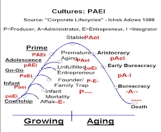 Зв’язок виразності тих чи інших складових у стилі управління зі стадією життєвого циклу в підході І.Адізеса носить значною мірою ілюстративний характер, який показує, що чим старша компанія, тим більше в ній бюрократії та жорсткості, і менше підприємництва та самоорганізації.