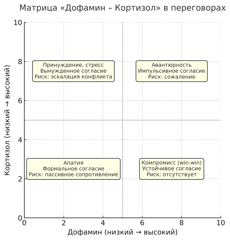 | Высокий дофамин + Низкий кортизол | Компромисс (win-win) | Устойчивое согласие | База для партнёрства |